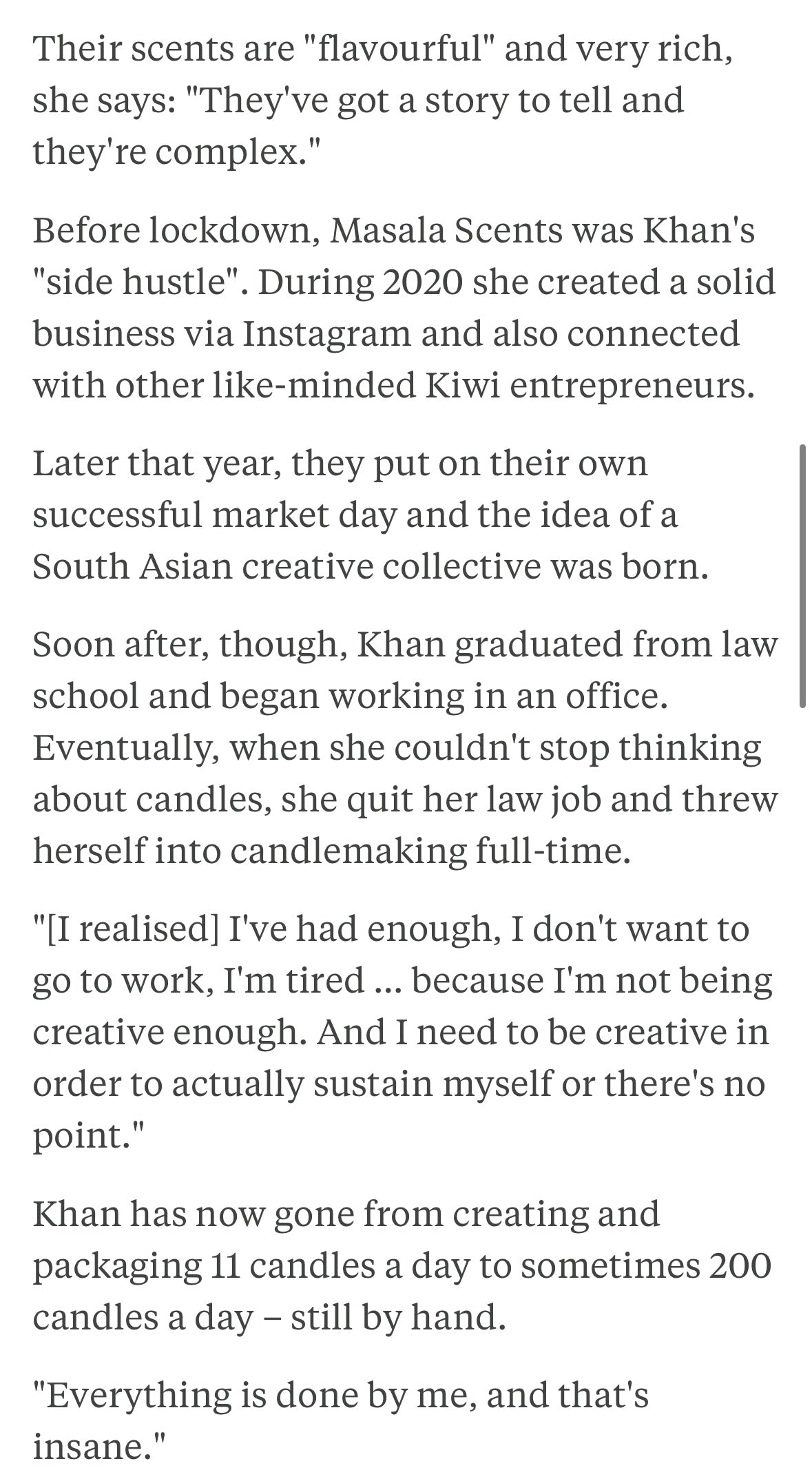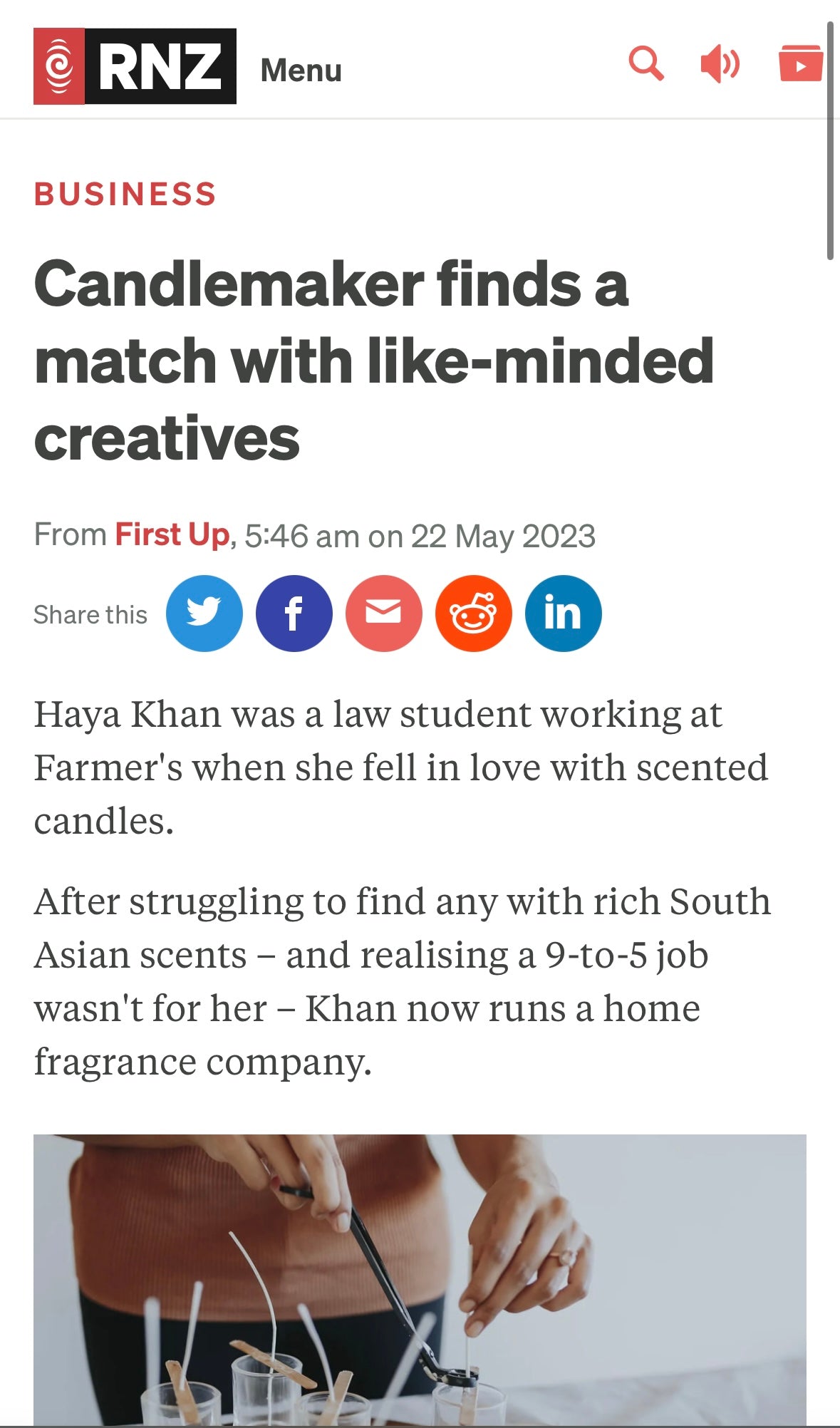 Radio New Zealand has shared the story of how our founder Haya Khan quit her legal career and pivoted to entrepreneurship and continues to have all Masala Scents products handmade by only her.