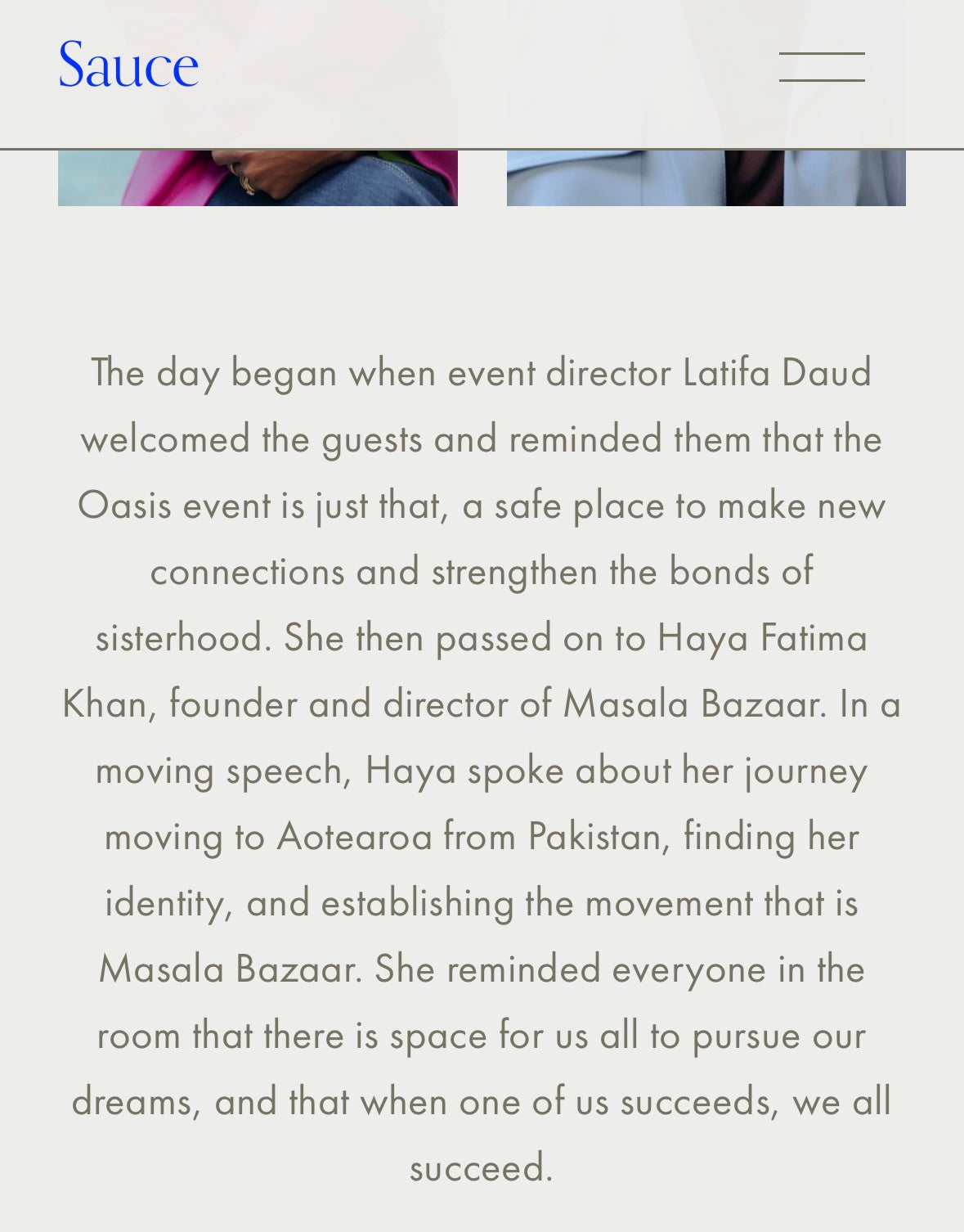 We have worked closely with Sauce and Viaduct Harbour to sponsor candles for their Oasis Habibti Lunch in 2022 and 2023. Our founder Haya Khan, was a guest speaker for their annual lunch in 2023.